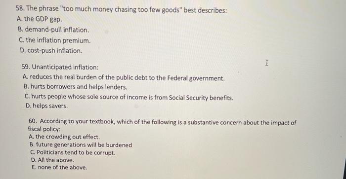 A the GDP gap. The phrase too much money chasing too few goods best describes. D the inflation premium.